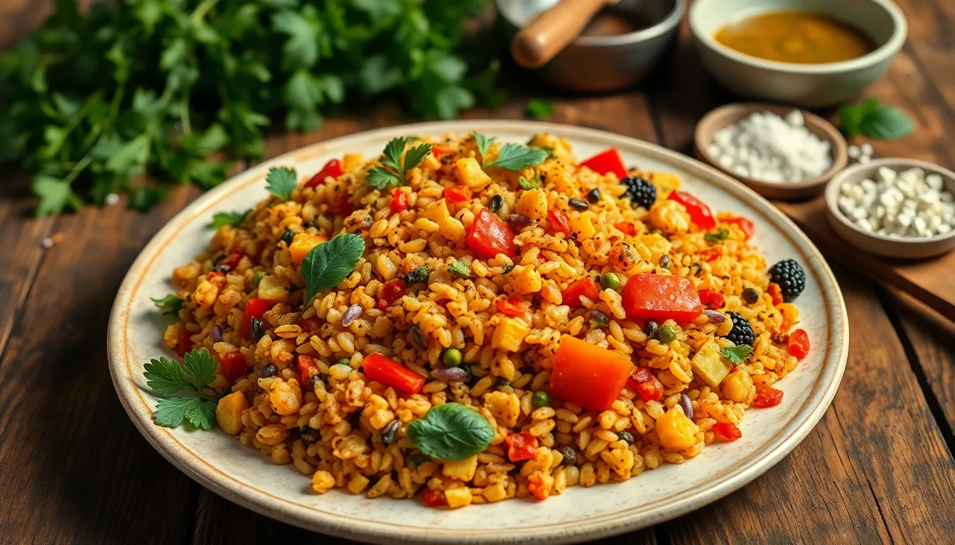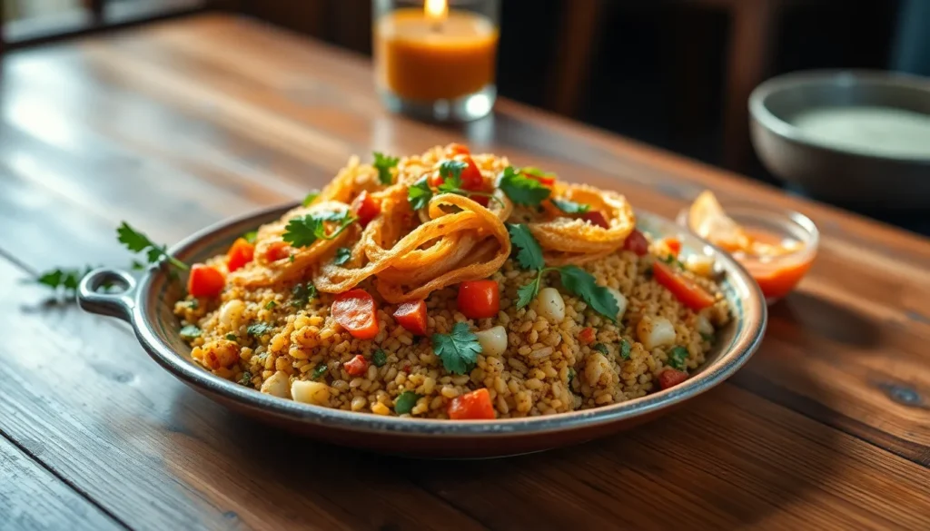 The preparation method incorporates slow-cooking processes that enhance flavor profiles. Chefs often layer spices, including cumin, coriander, and turmeric, to create depth in each serving. Textural contrast emerges through crispy toppings like fried onions or fresh herbs, balancing the softness of the grains and vegetables.